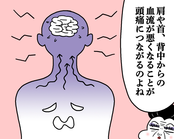 「そうなの。頭痛や頭がぼーっとする頭重感(ずじゅうかん)の原因が肩こりであることは、意外と多いのよ」