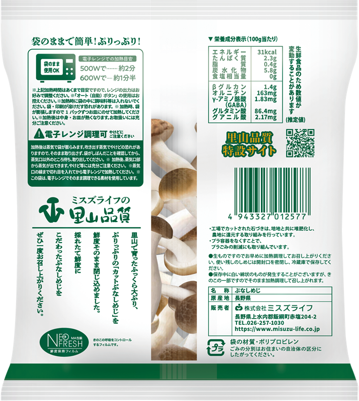 さらにミスズライフのぶなしめじは、同社が独自に開発したカットぶなしめじ専用の“黒姫S菌”という種菌品種。