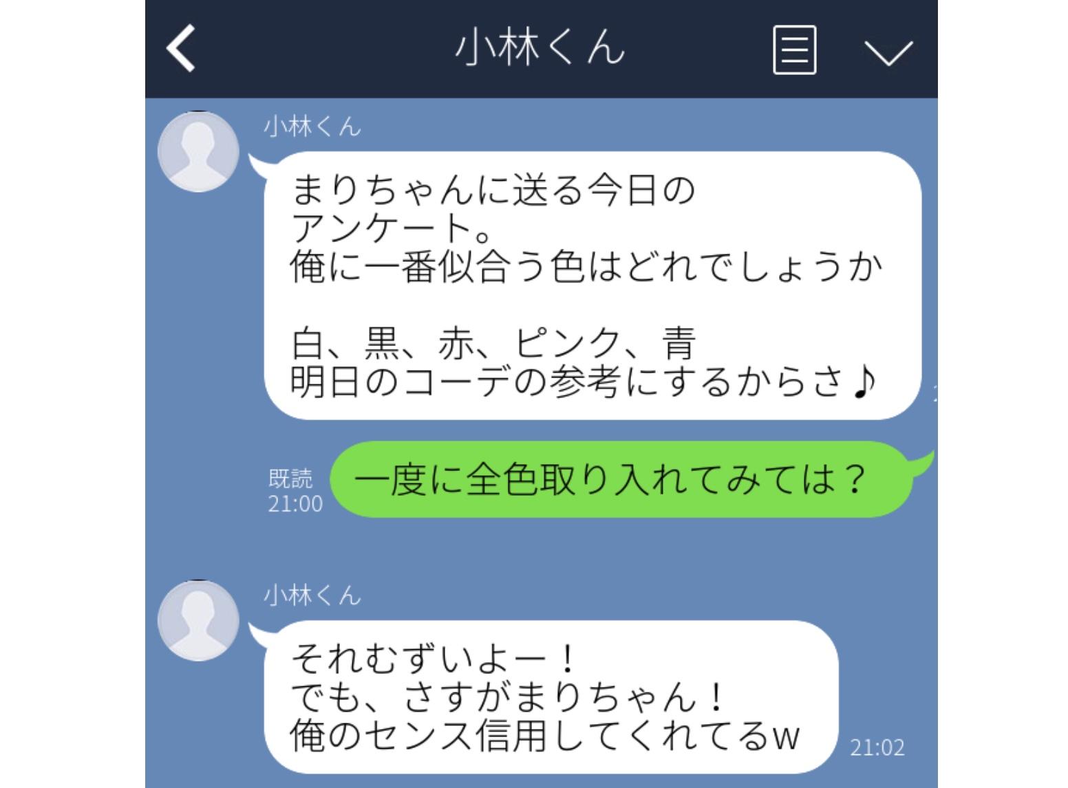 たとえばこちらのLINEは「俺に一番似合う色はどれでしょうか」というまさかのアンケート形式! この俺通信はコーデの参考にすると言っていますが、あまりに斬新だったので、まりちゃんは「一度に全色取り入れてみては?」と送り返したそう。