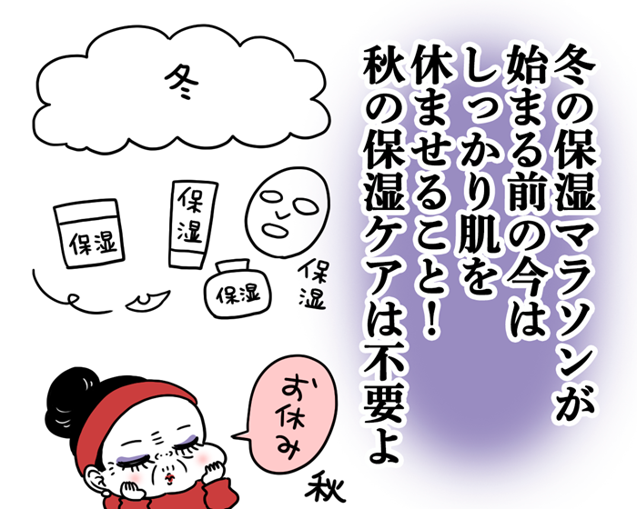 「そんなことはないわよ。秋だって冬のように空気が乾燥しているし、夏の紫外線ダメージでお肌がボロボロになっている可能性もあるわ。放置しておくと、あっという間にガサガサの肌になってしまうわよ」