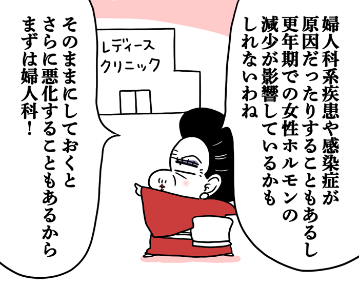 あとは、ミツキさんの年齢だと、更年期の女性ホルモンの減少が性交痛の原因になっているかもしれないわね」