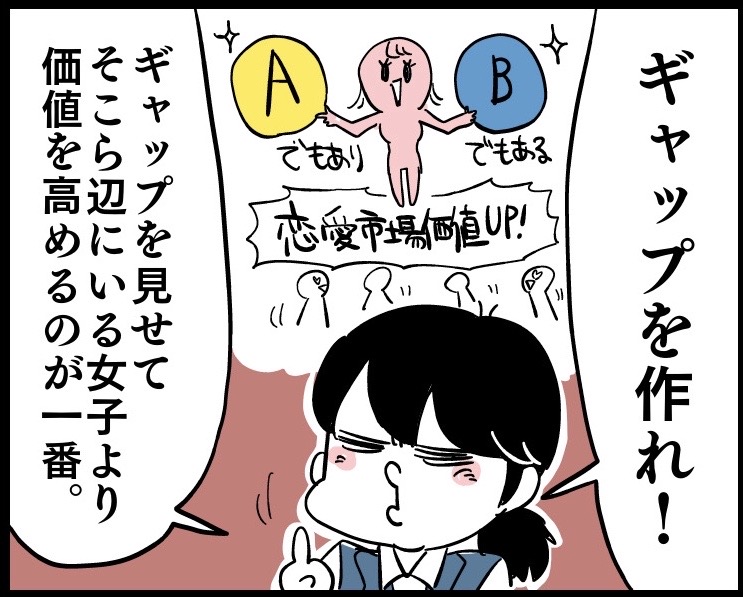 など、ギャップが大きければ大きいほど人として面白いし、男性にも刺さります。
