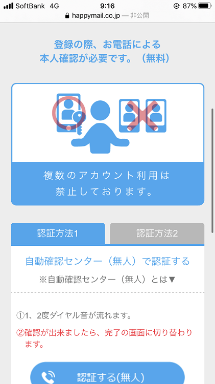 次に、本人確認が行われます。電話認証 or SMS認証を選び、登録を完了させます。
