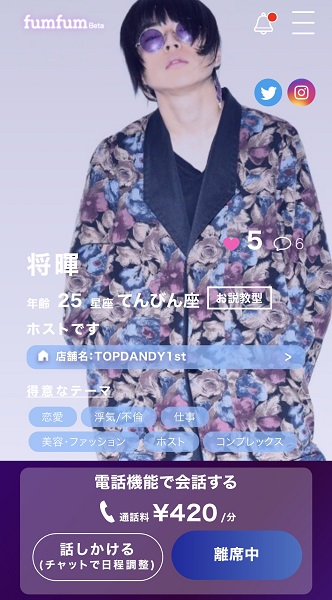 5月12日にリリースされた「fumfum(フムフム)」は、ホストクラブのホストやインフルエンサーなど、普段なかなか二人きりではお話しできない人と、マンツーマントークができてしまうというもの。システムは「電話」か「動画」どちらかを選択することができます。