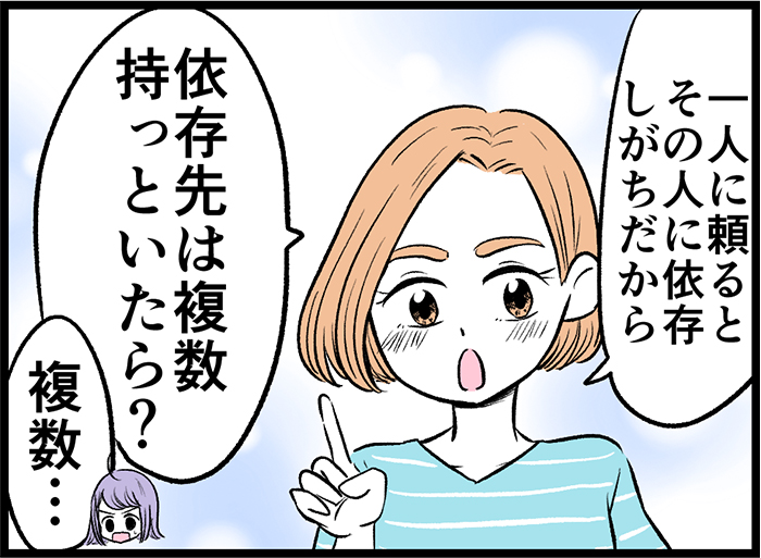 このように人や娯楽など、辛くなったときの頼り先を複数持つことで、依存度が分散され一人への負担が小さく済むのです。