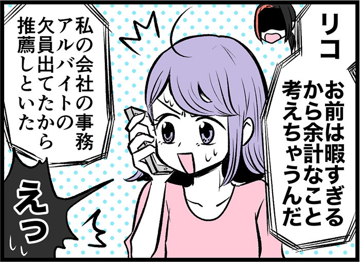 リコの高校時代からの友人。独身貴族なアラサーOL。朝型なのでいつも早めに布団に入るが、ここ数日は安眠を邪魔されて怒り心頭。でもほっとけないんだよなぁ、離婚直後の友人のこと。