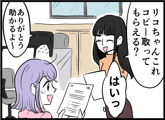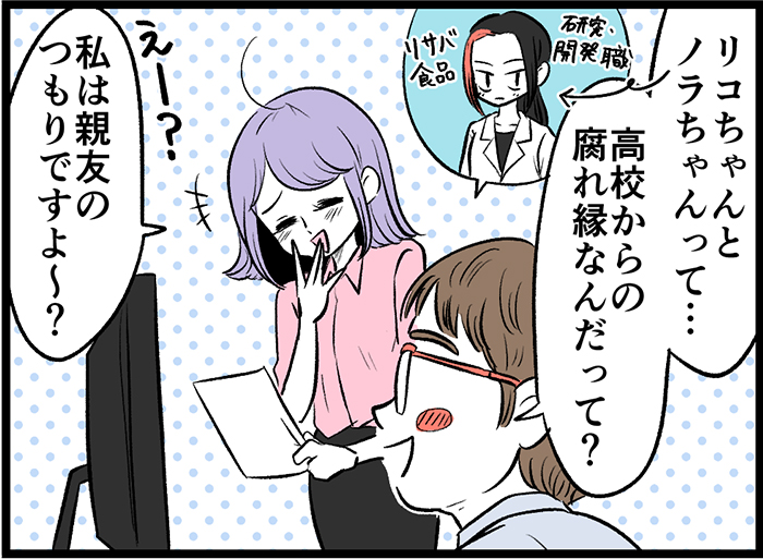 リコの高校時代からの友人。ひきこもり落ち込むリコを見かねて、自分の勤めている会社の求人にリコを推薦。実は食品メーカーの研究開発職でした! リコとは部署が違うけど、たまに気にして総務課に見にきてる。