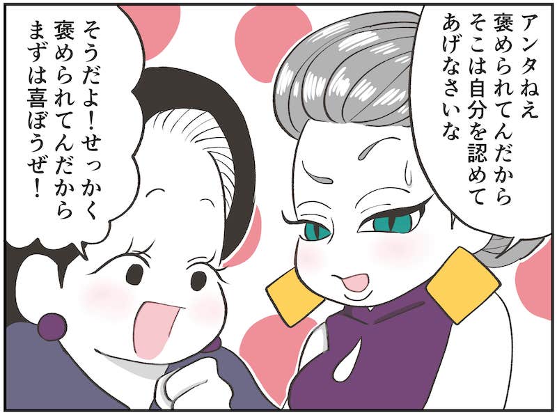 というのも、褒められることに慣れていないので、なんだか気恥ずかしさを感じてしまうんです。自虐的なことを言うと、その恥ずかしさが少し和らぐ気がするし……。しかも褒められると謎に不安になってきたりします。その不安との調和を保つために「いやいや! 私なんて体重〇〇キロのデブですから!」みたいな、全然関係ない自虐発言をしてしまいます。なんなら多めに。