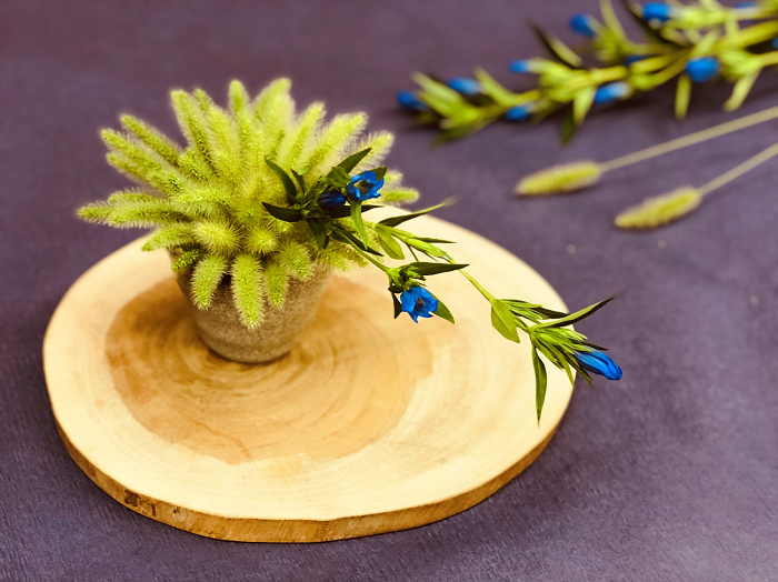 そば猪口に一本を切り分けたリンドウを雑草のエノコログサを花留めに