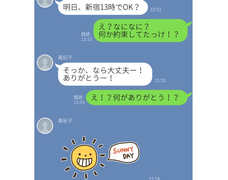 こちらのLINE、まったく意味がわかりません。約束した覚えはないのに、突然の待ち合わせ確認LINEからのお礼……。結局、約束していて単にこちらのミスなのか、向こうがただ誘いたかっただけなのか、真相は太陽マークのスタンプでさらに深い闇の中に葬られてしまったようです。