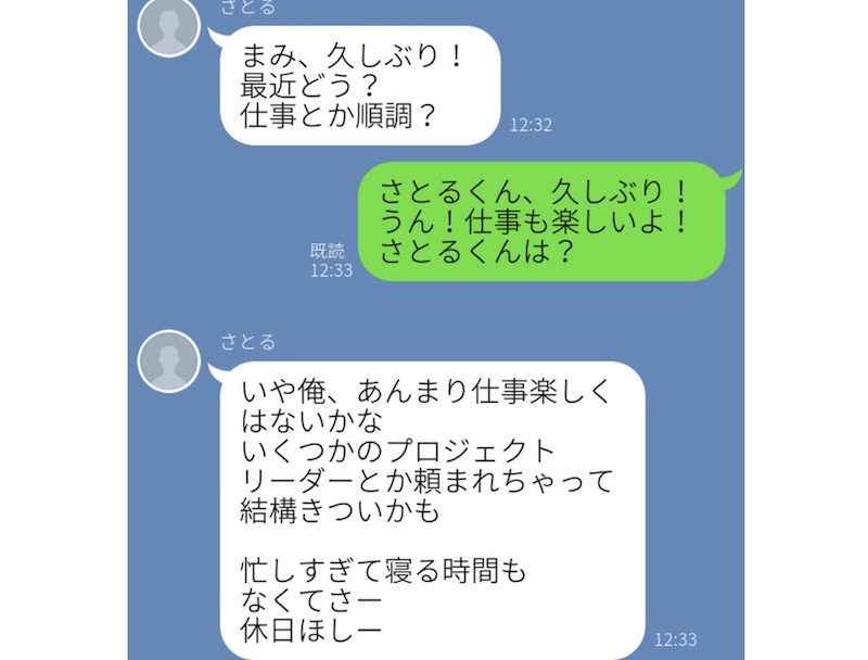 こちらの意味不明LINEは、いかにも悩んでいそうなフリをした自慢LINEでしょうか? 褒めて欲しいのか、相談にのってほしいのかがわかりませんね。また、久しぶりの友人に突然忙しいアピールをされても、どう返していいか返答に困ってしまいます。