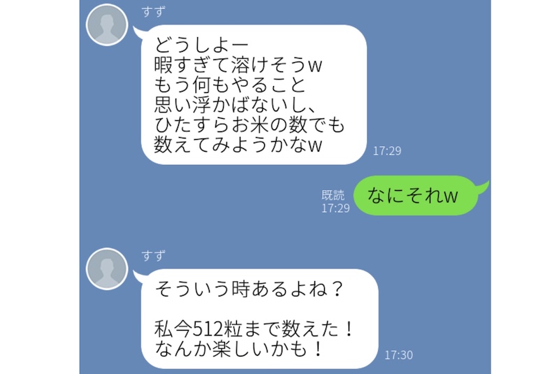 暇アピールをしてくる友達っていますよね。こちらの友達は、米粒を512粒も数えてしまうほどに暇だったようです。ただ、それを報告されても、正直なんと答えたら良いか正解は誰もわかりません。なにはともあれ、お米を数えるのが楽しくなってきたようでよかったですね。