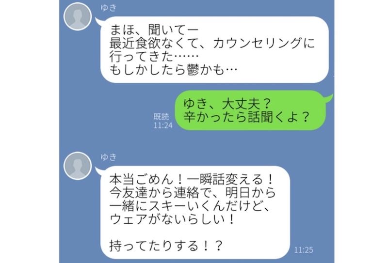 心配して損してしまった、意味不明LINEです。カウンセリングに行くほど精神的に追い詰められている友達に心から心配の言葉をかけたのに、一瞬で話題を明日からのスキー旅行に変えられてしまいました。毎日充実していそうで何よりですが、まったく意味がわからない不思議なLINEです。