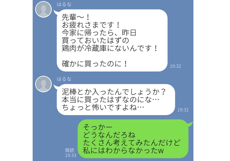 こちらのLINE、送られた女性の「私に聞いてどうするの?」という気持ちが画面から溢れ出ていますね……。勝手に鶏肉がなくなっていて怖い思いをしたんだと思いますが、「あなたにわからないなら、私にはもっとわかりません……」と思ってしまうのも無理ありません。