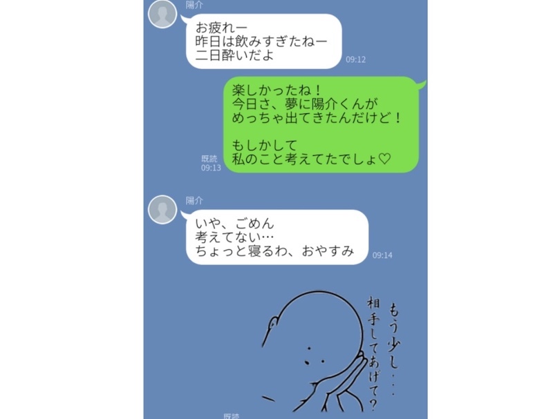 こちらの女性は、なかなか関係が発展しない片思い中の彼に、意を決して「私のこと考えてたでしょ♡」と、ハート付きでLINEを送っています。それなのに、二日酔い中の彼は、それどころではなかった様子。