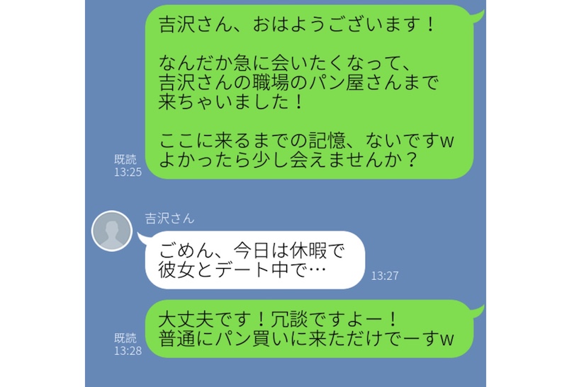 こちらの女性は、「好きな彼の職場まで気づいたら来てしまいました」と、思い切ったLINEを送ってみたそうです。それなのに、なんと彼女がいたことが発覚! 顔から火が出るほど恥ずかしくて、必死に冗談だったことにしたつもりだそうですが……。