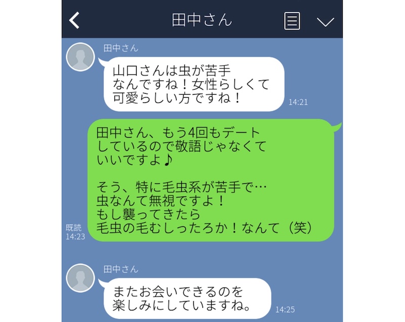 ところが、返ってきた返信は、「またお会いできるのを楽しみにしています」というもの。正直、真面目すぎて、冗談が通じたのかすらわからないですね。それにしても、なぜダジャレをチョイスしたのか……恋は盲目!としか言えません。