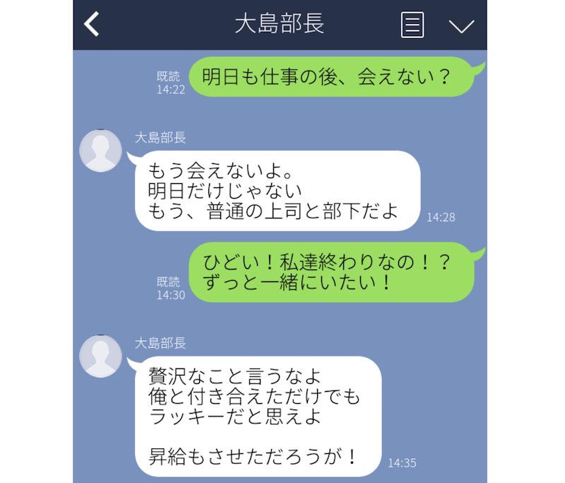 「ずっと一緒にいたい」と気持ちを伝えると、「昇給もさせただろうが! 付き合えただけでラッキーだと思え!」との返事が。もうこれは立派な職権乱用ですし、本当に身勝手な言い分ですよね。社内で噂になっているくらいなので、彼が会社を去る日もそう遠くはないでしょう。