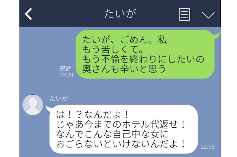 こちらの女性は、7年ほど不倫関係を続けていました。でも、奥さんには薄々バレてきていて、電話がかかってきたりと精神的にもきつかったので、思い切って別れを告げたそうです。すると、まさかの不倫相手から「今までのホテル代返せ!」「自己中女になんでおごらないといけないんだ!」というLINEが。