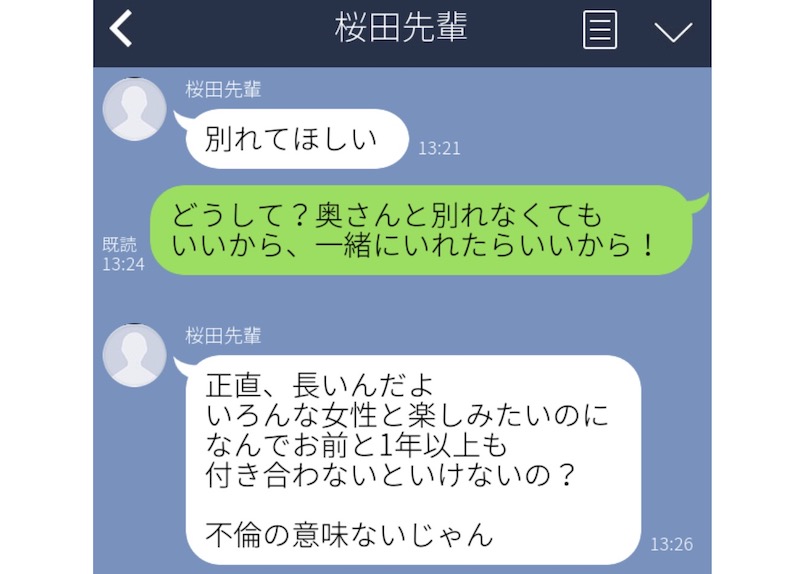 すると、なんと彼から「1人の女性と1年以上は長いんだよ! 不倫の意味がない!」という自分勝手で冷酷な返信が。愕然とした彼女は、どう返していいのかわからず、既読スルーしているのだとか。こんな自分勝手な男性とは、1日も早く縁を切ったほうが良いかもしれません。
