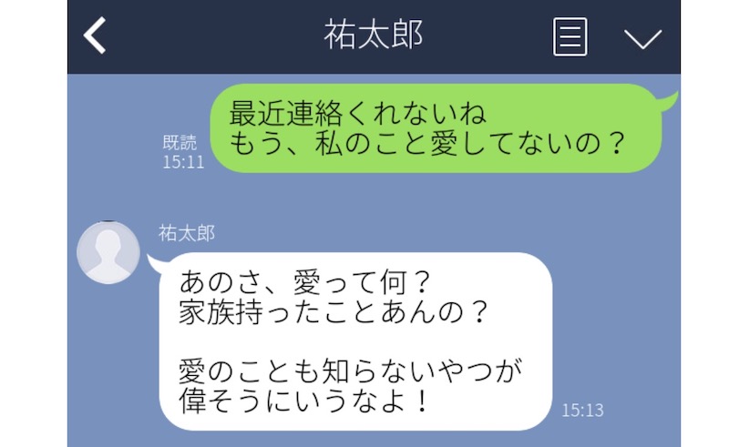 不倫相手からしばらく連絡が来なかったので、「私のこと、もう愛してないの?」と彼女から送った、こちらのLINE。その際の返事が、「愛って何? 家族持ったことあんの? 愛を知らないやつが偉そうにいうな!」というものでした。