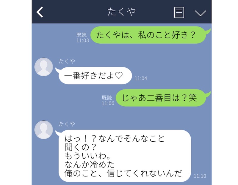 たとえば、こちらのLINE。普通のありきたりな会話ですし、彼女も冗談で「2番目に好きなのは?」という質問をしただけです。
