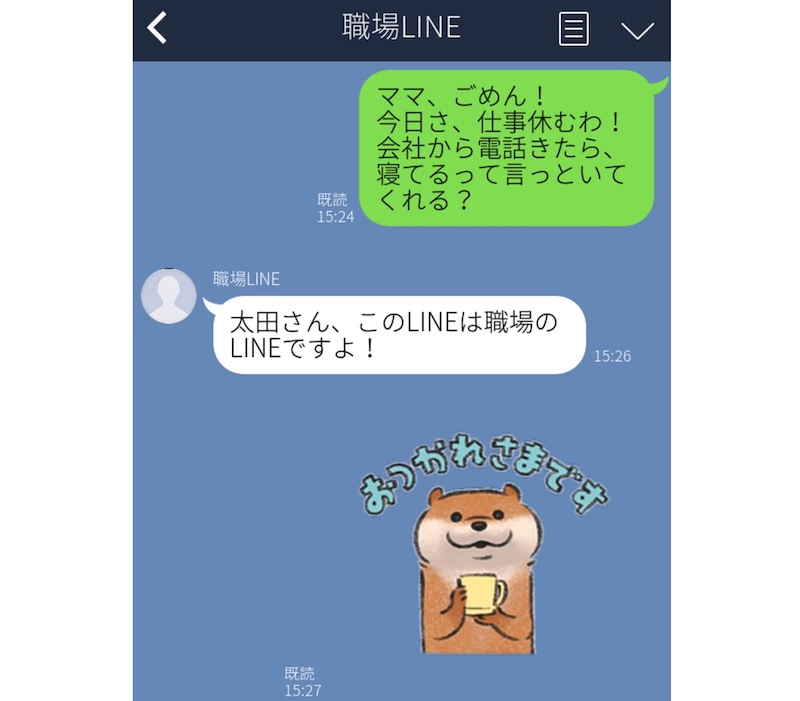 可愛くスタンプでごまかすという方法もあります。こちらの女性は、職場LINEに「ママ、今日仕事休むから、電話がかかってきたら寝てると伝えて」と送ってしまい、すかさずバレてしまいました。こんな時は、ほっこりする可愛い系のスタンプを送ってみましょう(笑)。