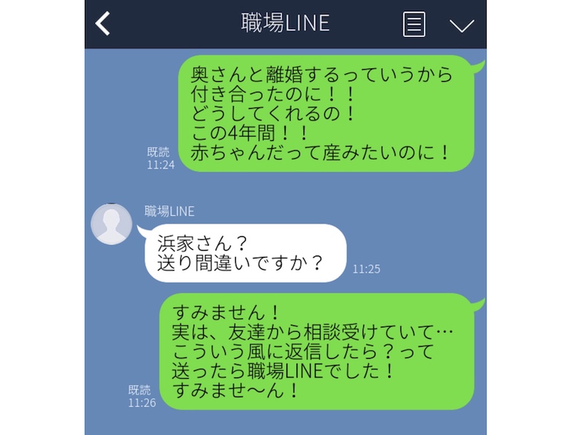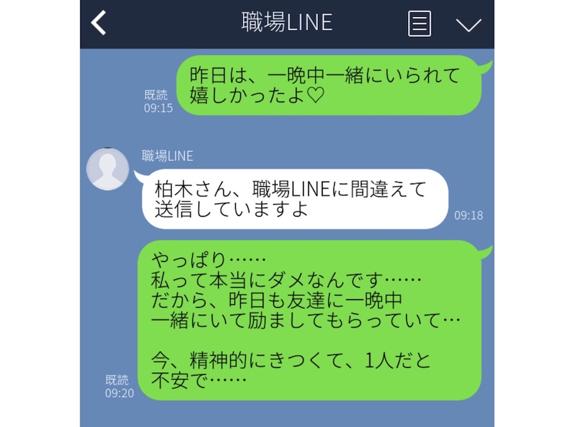 精神不安定を装って、相手にそれ以上突っ込ませないという方法です。こちらの女性、「昨日は一晩中一緒にいられて嬉しかった♡」と夜の生活を連想させる内容を、なんと職場LINEに送ってしまいました。