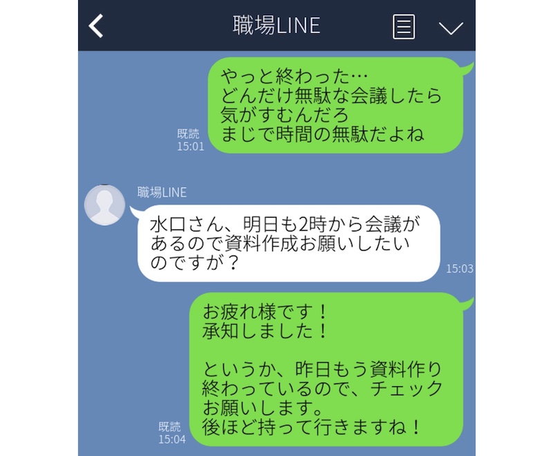 気付かないフリをしてごまかす方法もあります。たとえば、無駄な会議について愚痴っている内容を、職場LINEに送信してしまったこちらの女性。まるで嫌味のように、職場の人から資料作成をお願いされてしまいました。