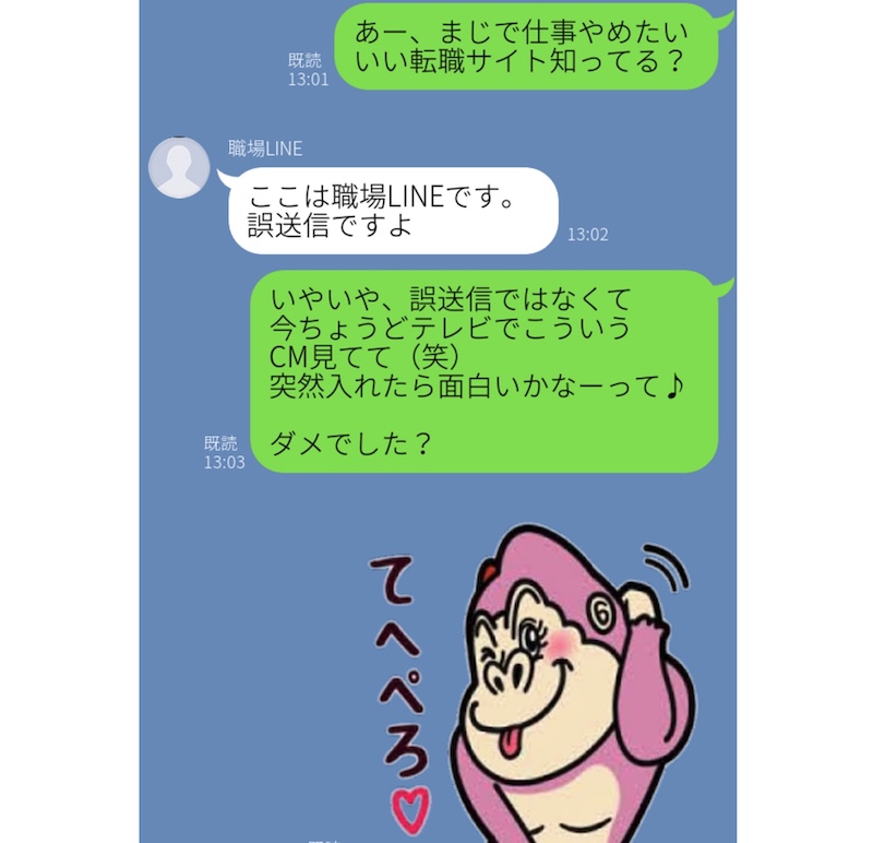 こんな時には、「誤送信ではなくて、転職サイトのCM見てたので送ってみました」「突然冗談で入れたら面白いかなと思ったけど……、ダメでした?」と、あくまで冗談だと貫き通してみましょう。さらに、てへぺろ系のスタンプを入れれば完成です。きっと、相手も笑って流してくれるかも!?