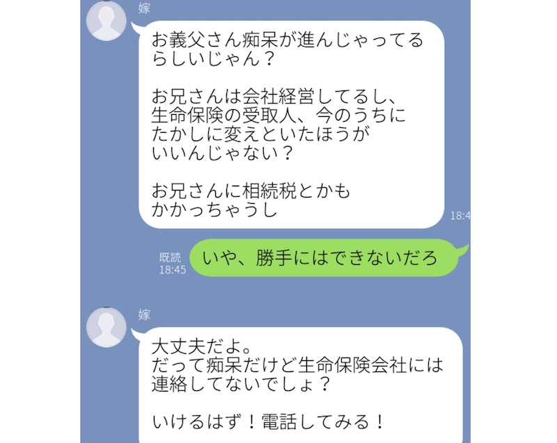こちらの嫁の腹黒さは、かなりのものレベルのようです。ある日のこと、嫁からLINEで「お父さんの痴呆が進んでいるから、今のうちに生命保険の受取人をあなたに変えたら?」「お兄さんは社長だし、相続税もかかるから」と送られてきました。