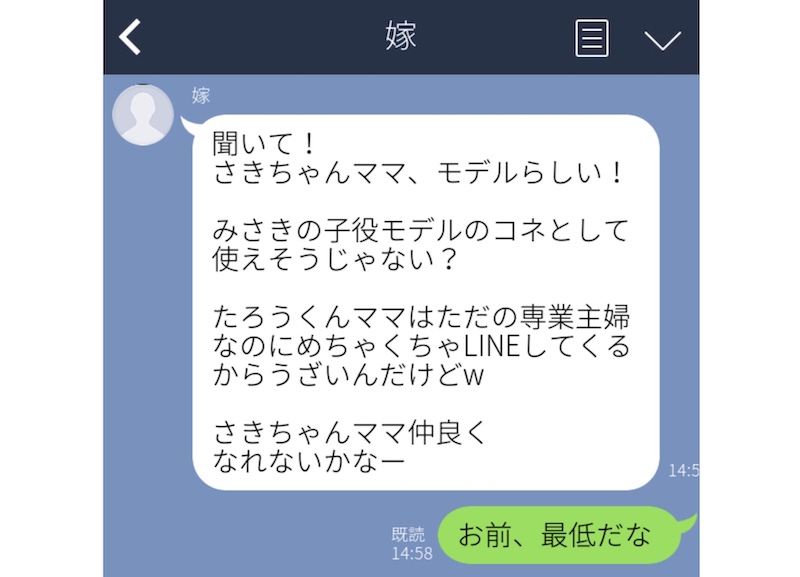 さらに「専業主婦のママがLINEしてきてうざい」と、比較するような内容も……。これには、さすがの夫も「お前、最低だな」と返信していますね。結婚する前にこの本性を知りたかった……と、心底思ったらしいですよ。
