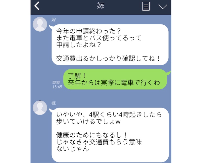 こちらの嫁は腹黒い上に、夫にひどい言動を繰り返しているようです。このLINEは、ある年、会社に交通費の申請を出した時のものですが「交通費が出るか確認してね!」「でも、あなたは交通費を使わないで徒歩で出勤して。浮いたお金を家計に使うから」という内容。