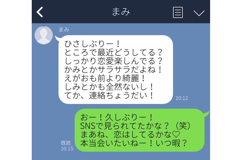 一見、仲の良い女友達同士のLINEに見えるこちらのやりとり。このLINEを受け取った女性は当初、普通の連絡だと思っていたそうです。でも、不自然にひらがなを多用した文章に、なんとなく違和感を覚えたのだとか。