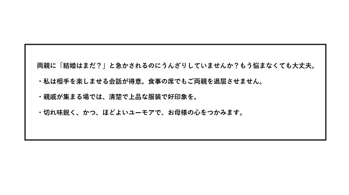 例えば、料理が好きなのであれば、「相手に晩酌のおつまみを作ってあげるのが得意」とか、英語が得意なら、「海外旅行中でも現地の人と普通に話せる」とか、そんな感じです。