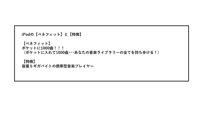 スティーブ・ジョブスのipodのプレゼンを事例にその違いを説明します。