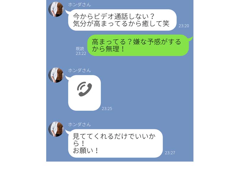 いちど断られているにもかかわらず、通話を開始しようとするホンダさん。「見ててくれるだけでいいから」という一文から、欲の強さが伝わってきます。