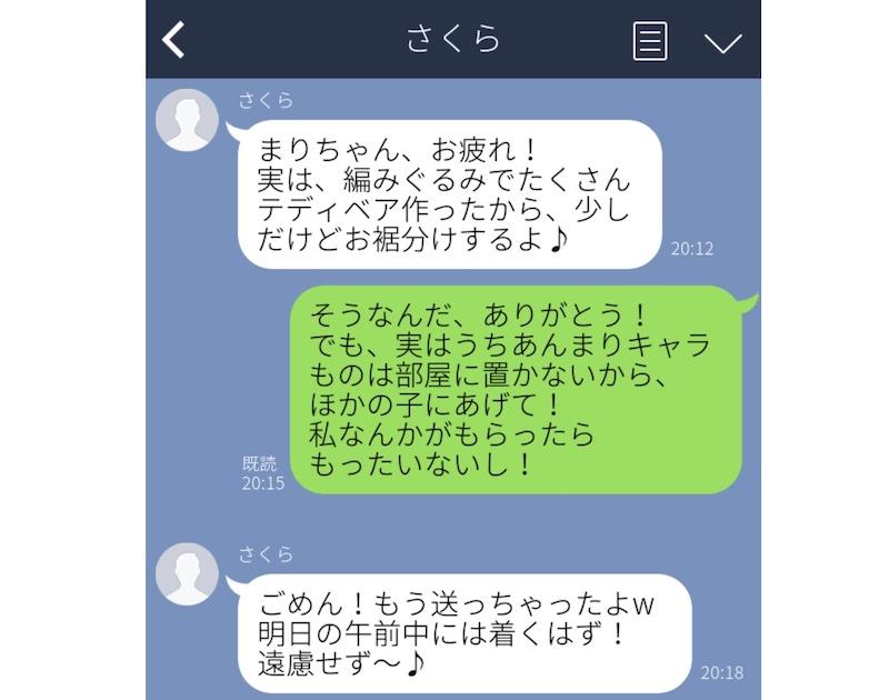 この日は、「編みぐるみでテディベアを作ったからお裾分け♪」とLINEがきたため、「部屋にはキャラもの置かないからほかの子にあげて」と伝えたところ、「もう送っちゃった」とひと言(笑)。