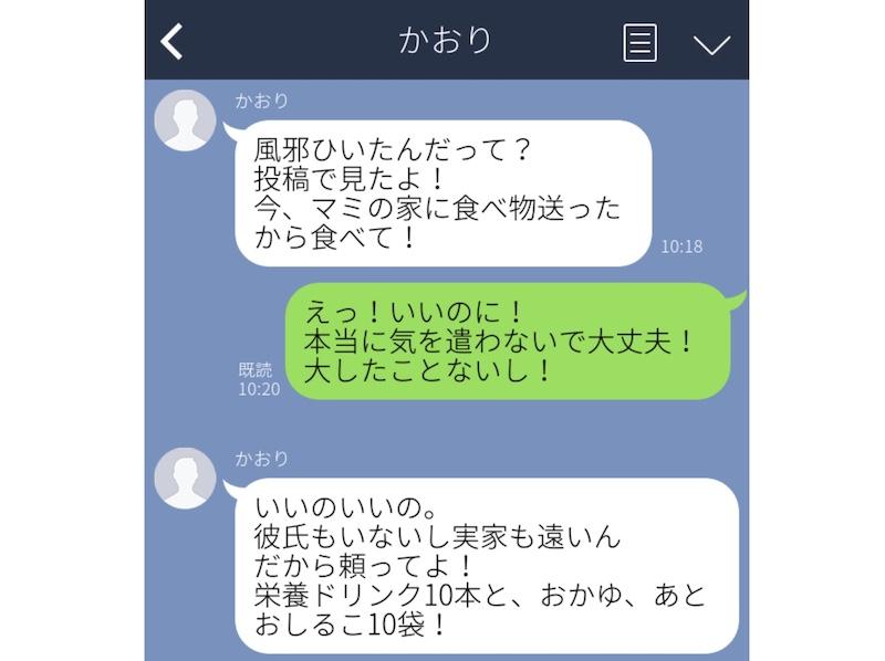 「風邪ひいたの? 食べ物送ったから食べて!」と、とにかく行動が電光石火!