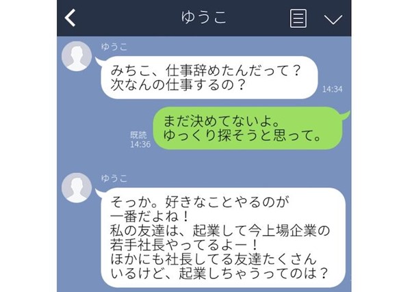 こちらの女性は、意識高い系の女友達から、「仕事辞めたんだって? なんの仕事するの?」と質問されました。そこで、「まだ決めてないよ」と答えると、突然、自慢話がはじまったそう。