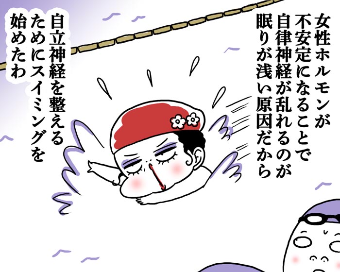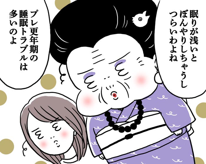 「プレ更年期には女性ホルモンの分泌が乱れて、眠りが浅くなる人もいるのよ。眠りが浅くなる以外にも、寝つきが悪くなったり、夜中に発汗して目覚めてしまったりと、プレ更年期にまつわる睡眠トラブルは人それぞれよ」
