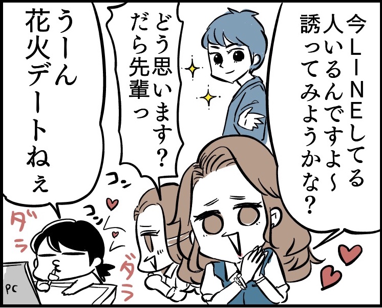 毎年花火大会に行っているのに“今年は誰とも行ってない、ヤバーイ!”と思っている。気になっているメンズは美容師でイケメンらしい。好きな屋台は牛串。