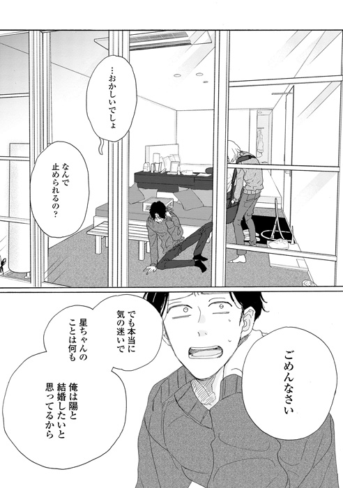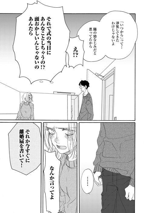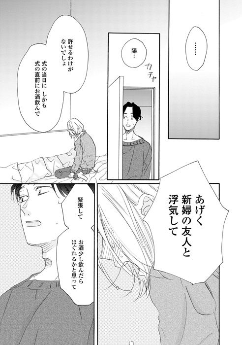 「夫さん、浮気してますよ」。結婚式当日に新婦・陽(よう)が目にしたのは、バスローブ姿の幼馴染・星(あかり)と、その横でいそいそとベルトを締める夫・木(もく)の姿だった――。