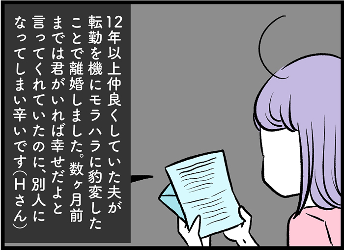 お便りをくださったHさんは信頼していた旦那さんが別人になってしまい、とても辛かったと思います。まずはストレスから離れ、安心できる環境に身を置いて、ゆっくり心身を回復できる時間が取れることを願っています。