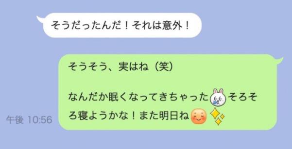 LINEをしている時間帯が夜なら、タイミングを見計らって「眠くなってきちゃった」というフレーズを使ってみましょう。終わりに「また明日ね♡」で締めることで、明日もLINEをする口実まで作ることができます。