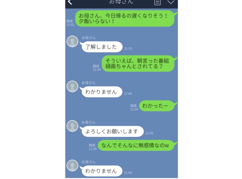 お母さんの中には、LINEを導入したはいいものの、文字を入力するのが苦手で、定型文のみで返信をしている人もちらほら見受けられます。こちらのお母さんは、話しかけてくる子供に対して、頑なに無感情を貫いていますね。ここまでくると、逆に癒されます。