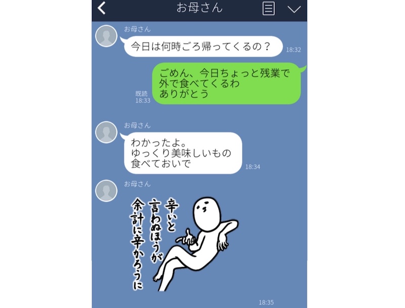 こちらのLINEでは、失恋か仕事で叱られたか、辛いことがあったのでしょう。お母さんから届いたLINEは、すべてを察しているかのような、またはスタンプを送り間違えたかのような内容です。結局、お母さんにはお見通しなのかもしれませんね。