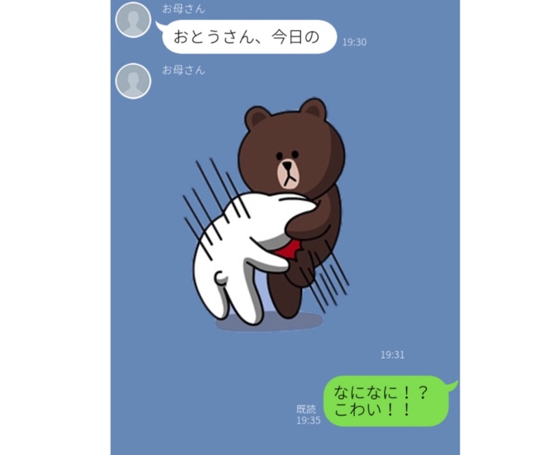 スタンプを使いこなしているかと思いきや、突然、おかしなタイミングでスタンプを送り間違えてくることもよくあります。こちらのLINEは、お父さんに送り間違えてしまったのでしょう。お父さんが無事だと良いのですが……。